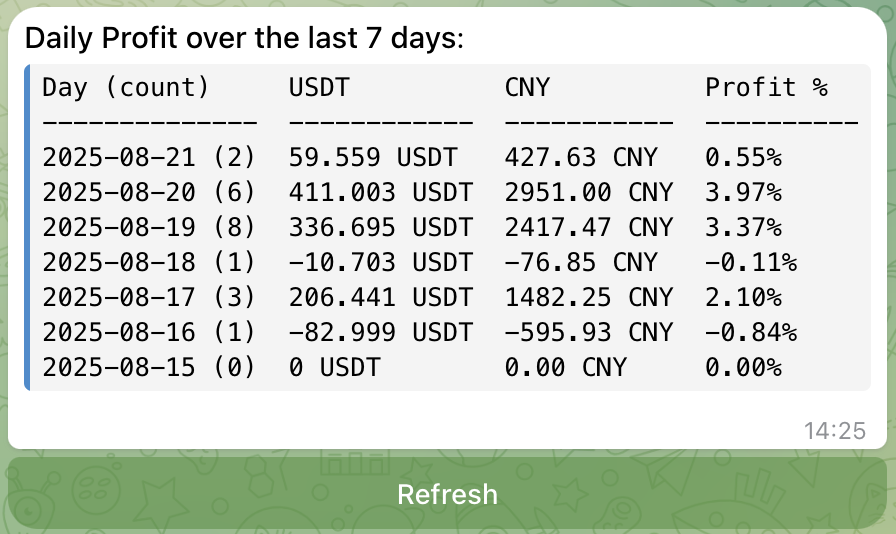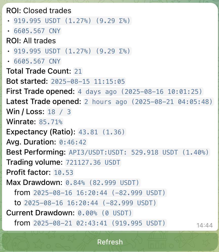 | Month | Trades | Avg Profit % | Tot Profit USDT | Tot Profit % | Win% | Drawdown % |